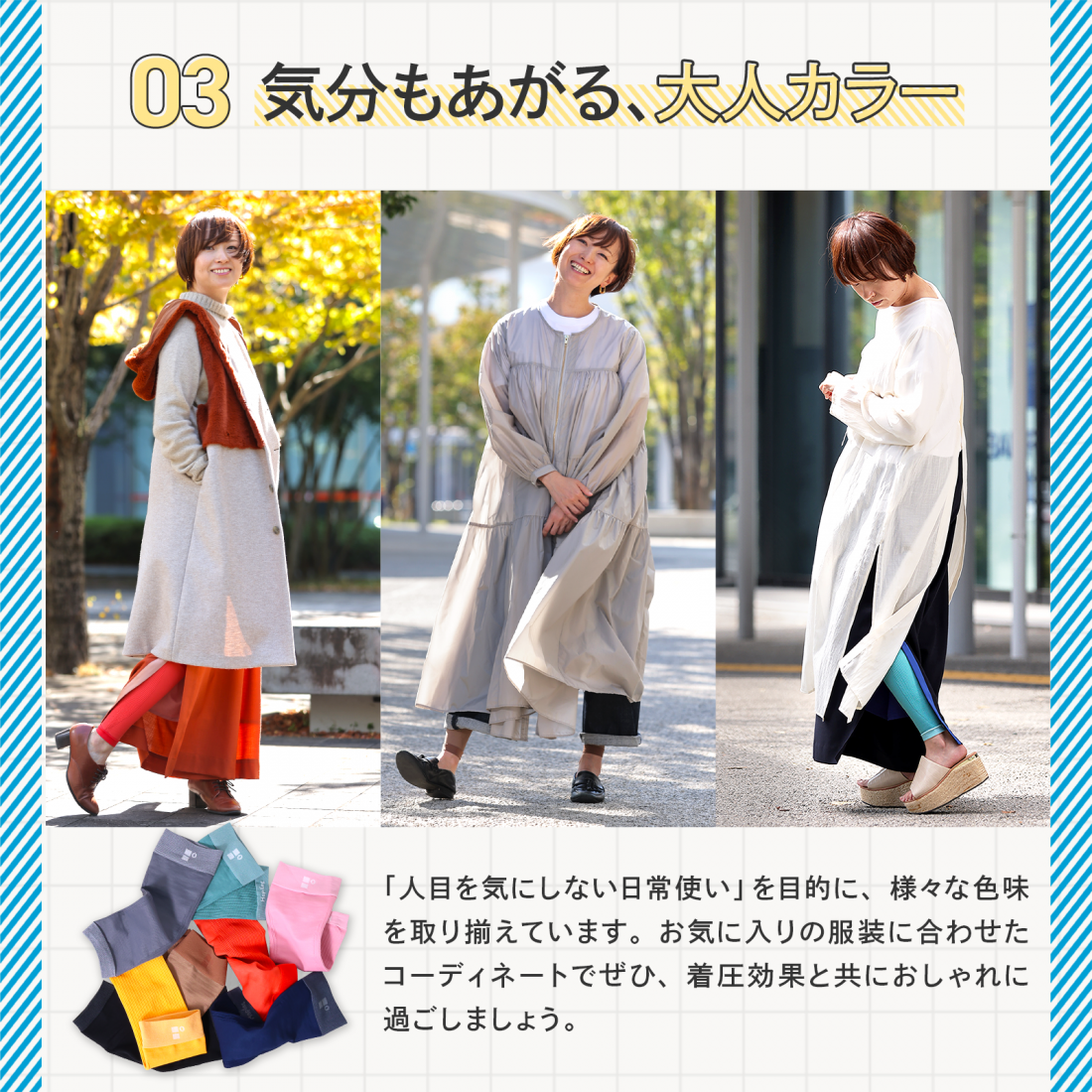 多彩なカラー展開も魅力の1つです。「人目を気にしない日常使い」を目的に、様々な色味を取り揃えています。お気に入りの服装に合わせたコーディネートでぜひ、着圧効果と共におしゃれに過ごしましょう。